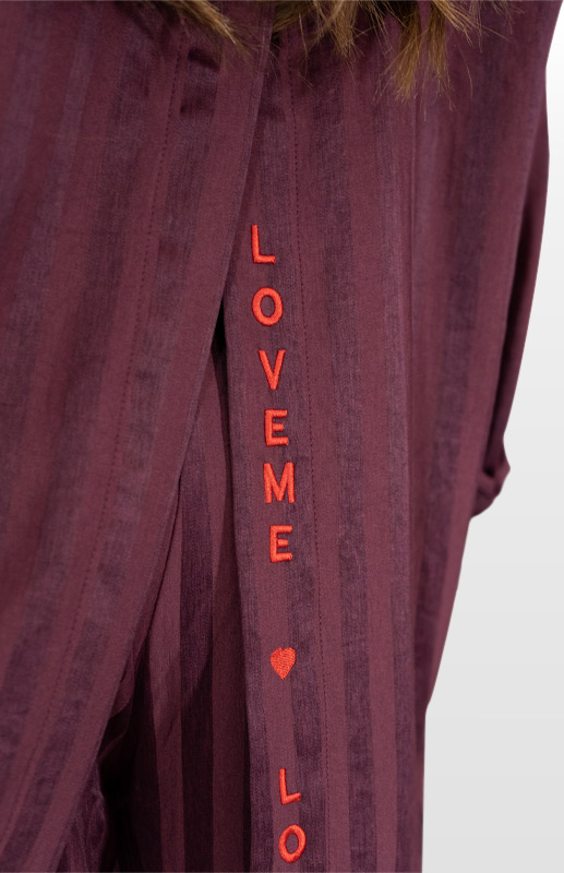 Coordinato morbido, camicia con spacco sulla schiena e ricamo a contrasto in rosso, pantalone a palazzo con laccetto in vita e tasche