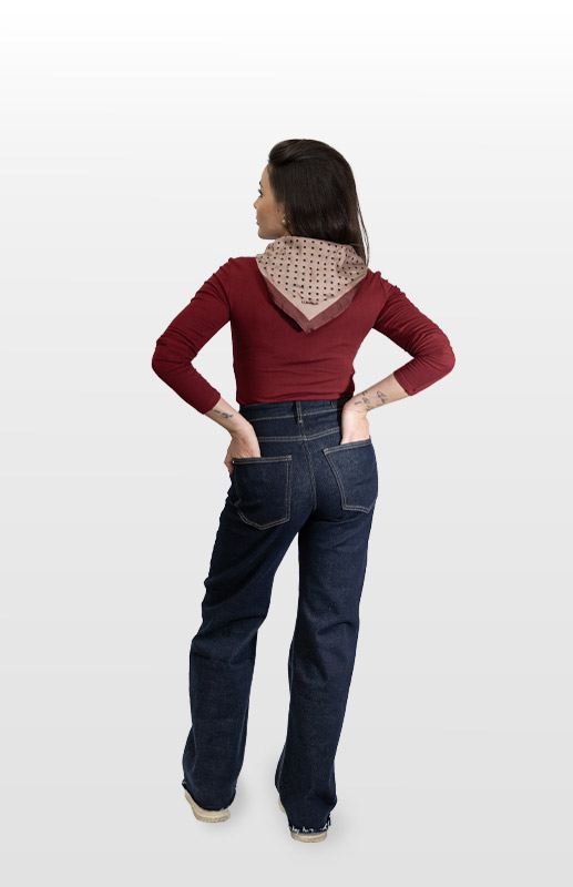 Jeans a vita alta lavaggio scuro, modello palazzo, chiusura con bottone e cerniera,tessuto elasticizzato taglio vivo sul fondo