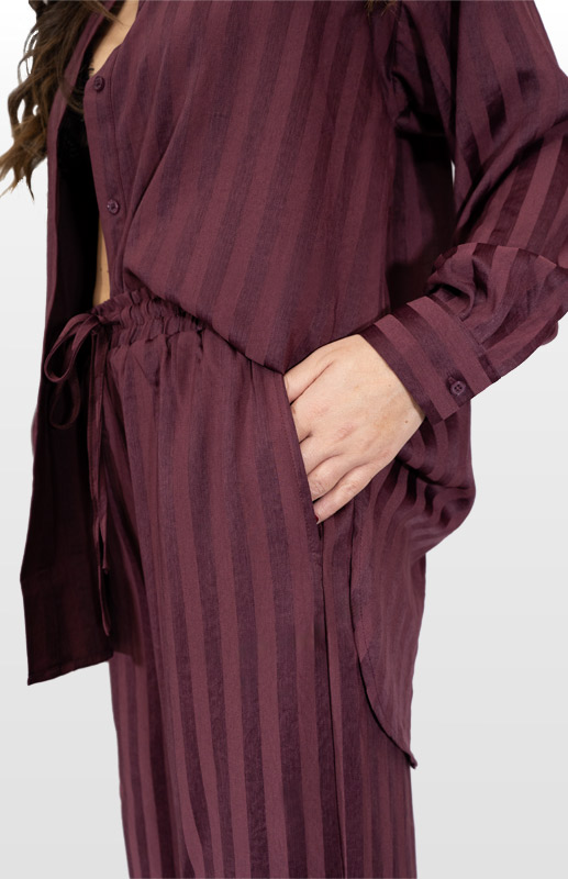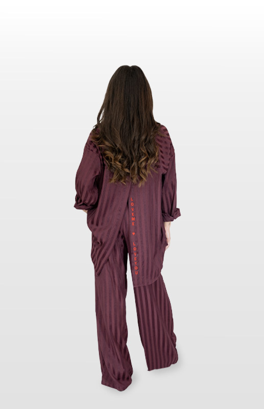 Coordinato morbido, camicia con spacco sulla schiena e ricamo a contrasto in rosso, pantalone a palazzo con laccetto in vita e tasche