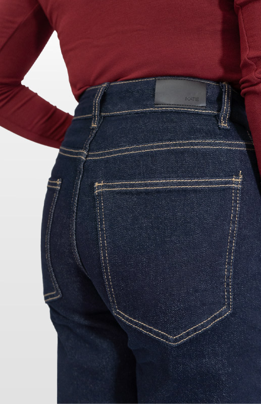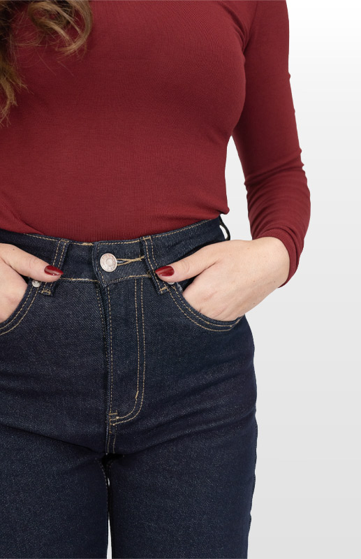 Jeans a vita alta lavaggio scuro, modello palazzo, chiusura con bottone e cerniera,tessuto elasticizzato taglio vivo sul fondo